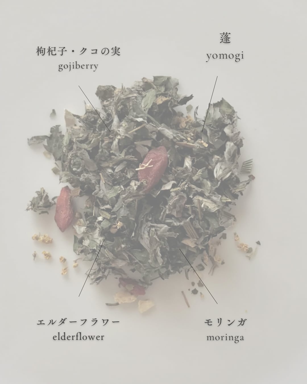 よもぎ、モリンガ、クコの実(枸杞子)、エルダーフラワー