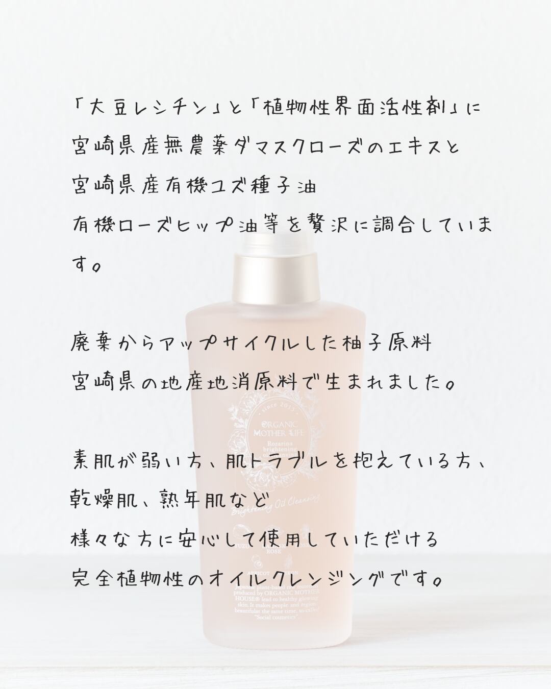 宮崎県産無農薬ダマスクローズのエキス、宮崎県産有機ユズ種子油、有機ローズヒップ油等を
